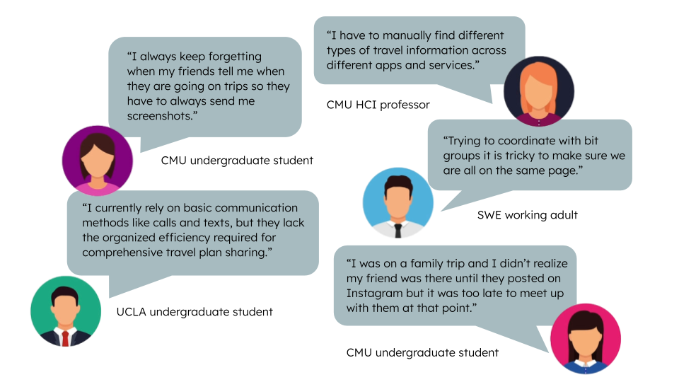 Through interviews with students, professionals, and academics, we uncovered a consistent pain point: coordinating travel plans with others is fragmented, inefficient, and often leads to missed connections. Users rely on scattered tools such as texts, screenshots, calendars, and social media, to share or track travel plans, resulting in forgotten dates, lack of real-time updates, and missed opportunities to meet. Whether it’s forgetting a friend’s trip, struggling to align group schedules, or finding out someone was nearby too late, users expressed a clear need for a centralized, lightweight, and private way to coordinate travel with their personal networks.