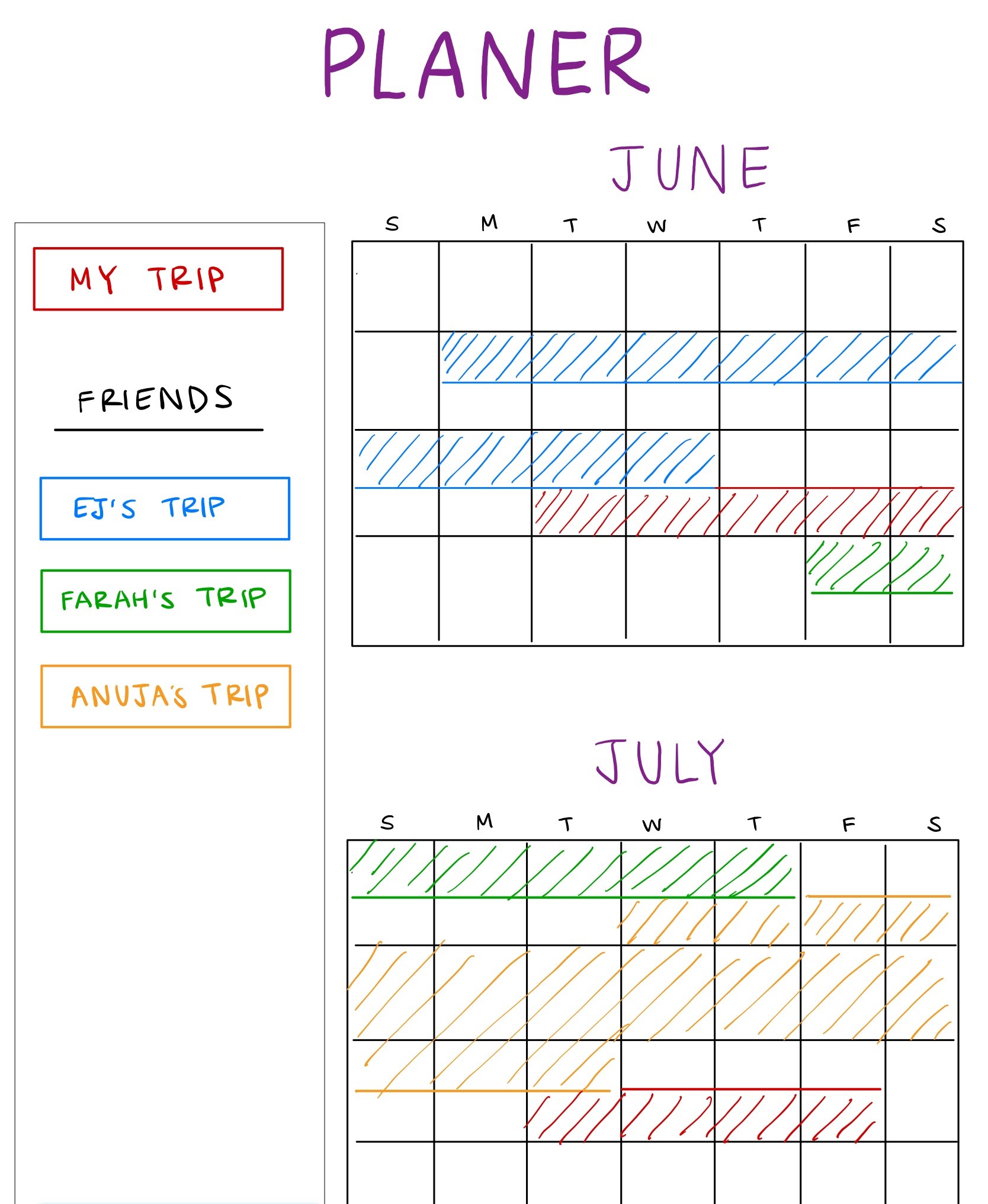 Our MVP began as a shared calendar concept, allowing users to log travel plans and view their friends’ trips in one place. We focused on visual clarity by incorporating features like color coding, a monthly view, and the option for a more detailed daily view. Initially, we assumed users would prefer a calendar layout and introduced a friends list tab to toggle visibility. Early versions used subtle dots to indicate overlapping trips, but usability testing showed these were often overlooked. In response, we redesigned the interface with bold overlap bars and added friends’ profile photos directly on shared dates, making trip overlaps more visible and connections easier to recognize.